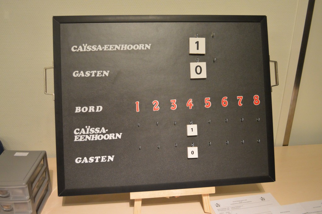Caïssa-Eenhoorn is niet de enige club met een scorebord voor bondswedstrijden, maar het kan na gisteravond wel de strijd aangaan met andere verenigingen wie het mooiste heeft. Voor aanvang van het thuisduel van het derde tegen Krommenie 2 werd het door Yvonne Holscher gemaakte scorebord gedoopt.