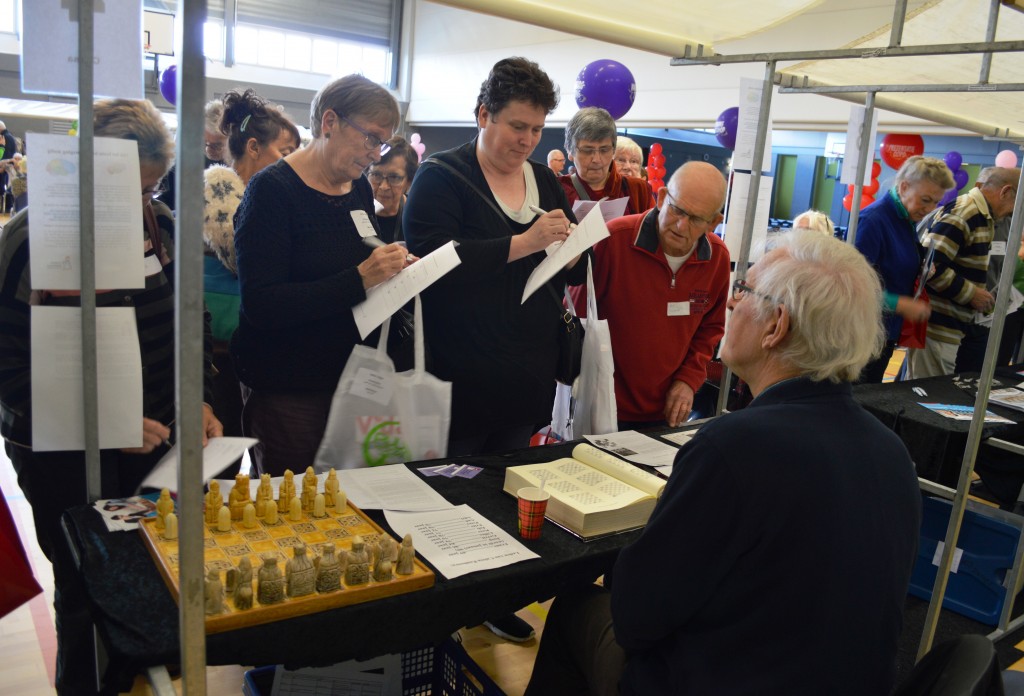 Veel belangstelling bij de kraam van Caïssa-Eenhoorn. De bezoekers moeten een door Arend Stapel gestelde schaakvraag beantwoorden en kunnen daar een prijsje mee winnen.