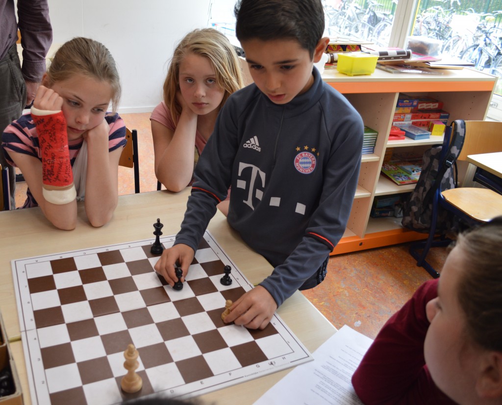 ‘De school waar je uitgedaagd wordt’ is de slogan van Wereldwijzer en Co Buysman, Sander Koning, Gijs Leene, Ger Roos en Arend Stapel dagen de leerlingen van de groepen 6, 7 en 8 uit. In een uur tijd schaken leren is onmogelijk en daarom leren in de eerste sessie jongens en meisjes van groep 7/8 hoe paarden, lopers en torens zich bewegen op het schaakbord en in het tweede uur volgen de kinderen van groep 6/7 de mini-cursus. Onder de belangstellende ogen van de juffen Rina en Marloes en contactpersoon Lindsey speelt de jeugd op een enthousiaste manier de Koningsmatch.